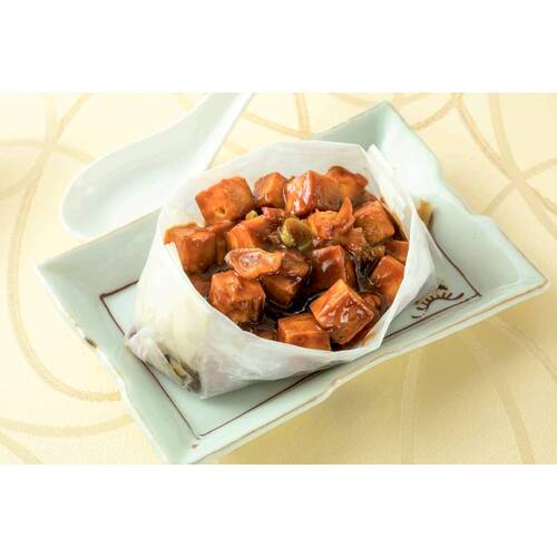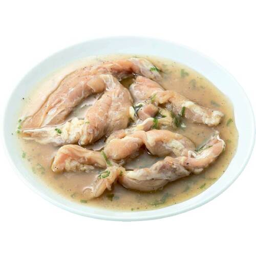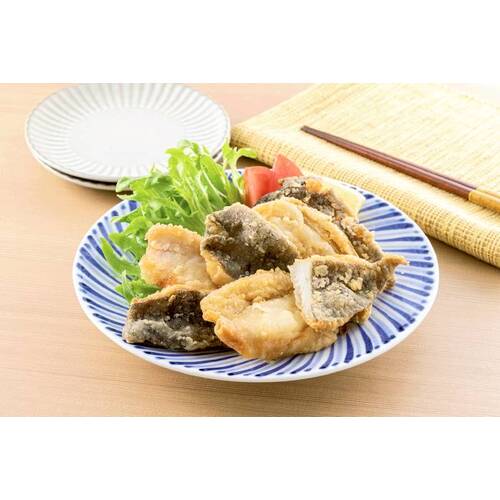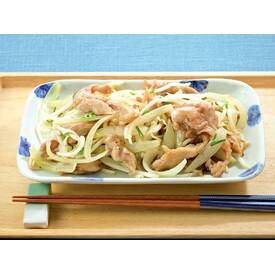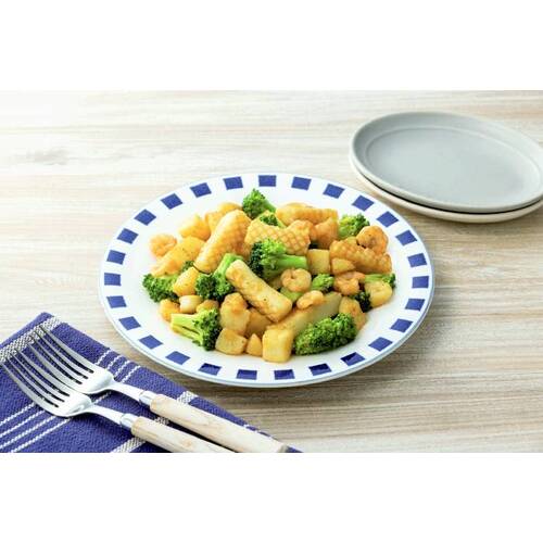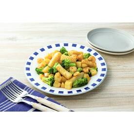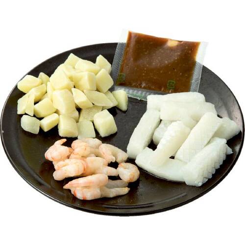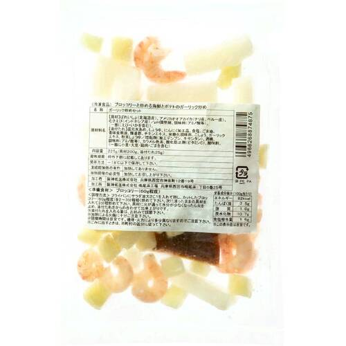 北海道産ばれいしょ、チリ・ペルー産アメリカオオアカイカ、インドネシア産むきえびを使用。カットしたブロッコリーを加えてたれと炒めるだけで簡単にガーリック炒めができます。