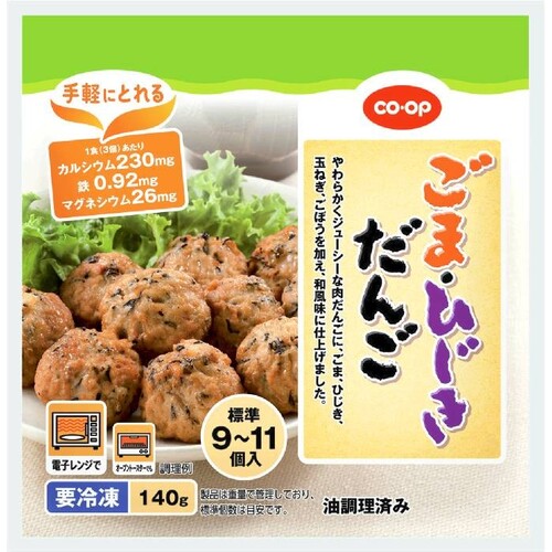 (税込235円)ひと口サイズの国産鶏肉の肉だんごに、ごま、ひじき、ごぼう、たまねぎを加え、しょうゆベースの和風味に仕上げました。ごま、ひじきの風味が楽しめます。お弁当はもちろん、炒め物や鍋の具材などにもどうぞ。1食(3個・平均重量42g)あたりカルシウム230mg、鉄分0.92mg、マグネシウム26mgがとれます。・賞味期限1年 ・日本生協連(サンオーク)/国内製造 ・フジフレッシュフーズ株式会社次回予定: