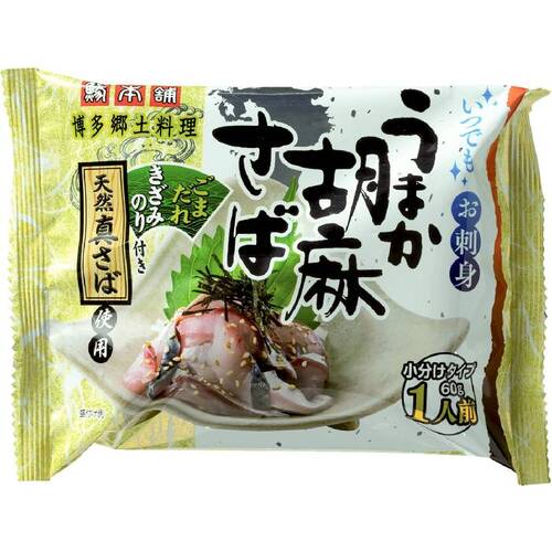 • 天然真さば(国産)を使用。迅速に加工し、急速凍結することで、美味しいさばのお刺身が味わえます。胡麻だれときざみのりを添付しました。さばのお刺身とあわせて、博多の郷土料理「胡麻さば」をお楽しみください。1人前。