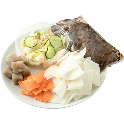 • 国産豚もつを使用。もつ味噌和え、野菜(大根・人参)、こんにゃく、キャベツ和えをセットしました。セット内容 もつ味噌和え:230g 野菜:150g(大根・人参) こんにゃく:60g おつまみキャベツ:120g 調理時間目安約15分 ※ごま油はご用意ください