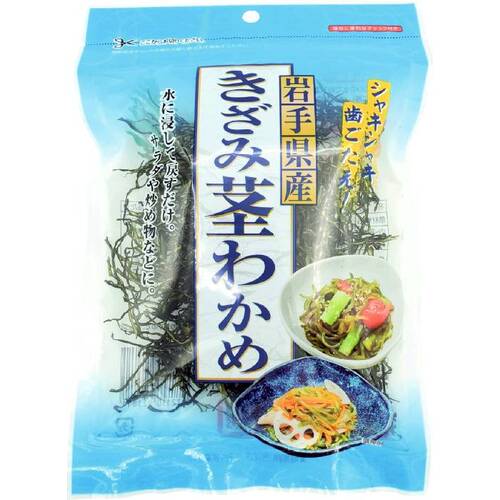 • 岩手県産茎わかめをきざんで乾燥させました。水に約10分浸して、戻してお使いください。約10倍に戻ります。サラダ、炒め物等にどうぞ。