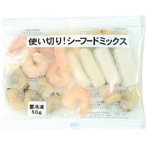 • いか・あさり(中国産)、えび(インド・インドネシア産)の3種類をミックス。50gの使い切りタイプです。加熱調理用。