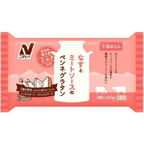 • 豚肉、たまねぎ、にんじんを使用したミートソース、宮城県蔵王産ミルクを使用したホワイトソースに揚げなすをトッピングしました。濃厚でクリーミーな味わいです。生協限定品。