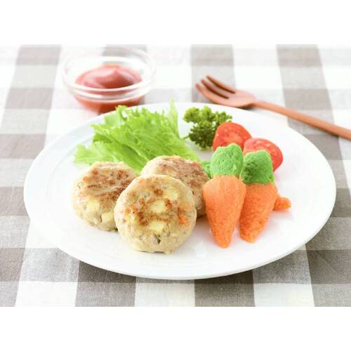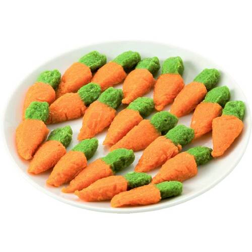 にんじんの形をしたさつま揚です。アメリカ産魚肉、緑色はほうれん草ペーストと着色料(紅麹・クチナシ)、オレンジ色はにんじんペーストとカロチノイド色素を使用。お弁当などにひとつそえるだけで彩り豊かなお弁当に仕上がります。