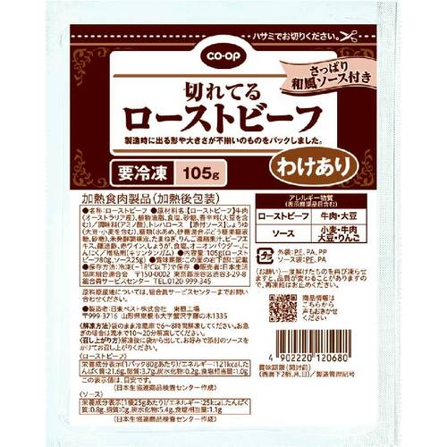 牛肉(オーストラリア産)を使用。そのまま盛付けるだけの使いやすい切れてるローストビーフのスライスパックです。製造時に出る、形や大きさが不揃いのものをパックしました。お好みで、添付のさっぱり和風ソースをかけてお召しあがりいただけます。サラダ、サンドイッチにどうぞ。