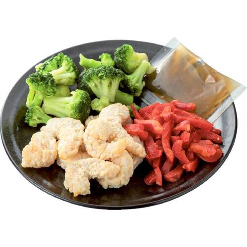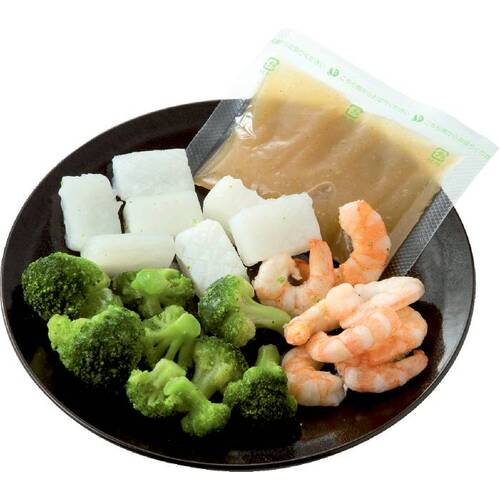 • むきえび(インド産)、アメリカオオアカイカ(チリ、ペルー産)、エクアドル産ブロッコリー、塩レモンたれをセットしました。ご家庭で玉ねぎ半玉(中サイズ約85g)を加えて簡単につくれます。