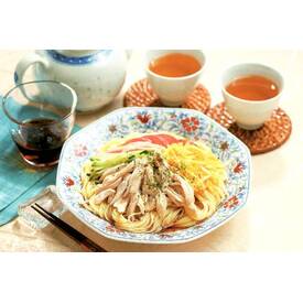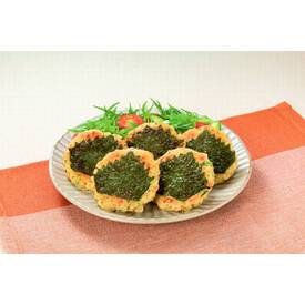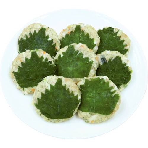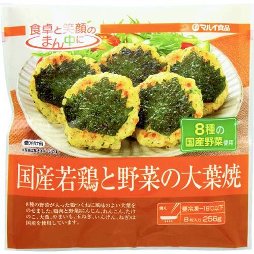 若鶏ムネ肉(国産)、8種の国産野菜(にんじん、れんこん、たけのこ、大葉、やまいも、玉ねぎ、いんげん、ねぎ)を使用。大葉をのせ、生地にも加えることで、大葉の爽やかな風味を高めています。しょうゆベースにかつお節エキスを加え、和風味に仕上げました。