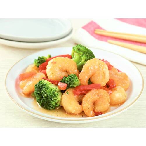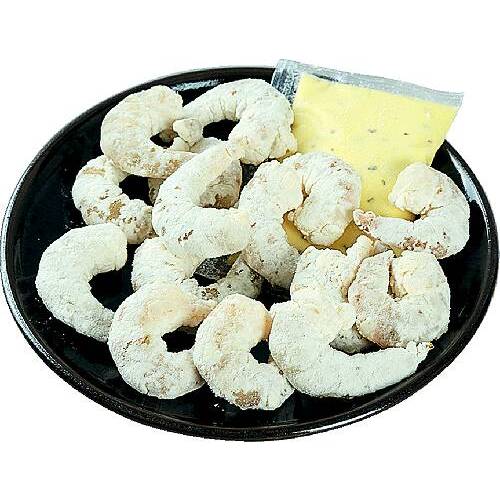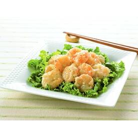 • インドネシア産養殖えびを殻むきし、下味を付けたあと粉付けしました。柔らかい身質で、甘みがあるのが特徴です。ソース付き。