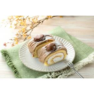 国産小麦で製造した小麦粉を使用したふわふわのスポンジ生地に、ほんのりブランデーの香りのするホイップクリームを巻き、1本1本手巻きした表面に渋皮栗ペーストとホイップクリームをブレンドしたモンブランクリームを絞り、表面に渋栗皮付甘露煮を3粒トッピングしたロールケーキです。長さ約17cm。