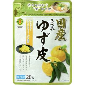 国産ゆず皮を使いやすいようスライスし、冷凍パックで爽やかな香りを閉じ込めました。素材の色を引き立てる鮮やかな色が特徴です。