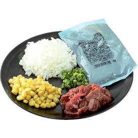 にんにくと胡椒のきいた、夕食やお酒のアテにピッタリな一品です。セット内容 肉:牛肩ロース肉100g 野菜:145g(玉ねぎ・コーン・小ねぎ) ガーリックライスの素:100g 調理時間目安約15分 ※ご飯はご用意ください
