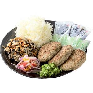ハンバーグ、キャベツ、大根おろし、ぽん酢、おろし用野菜(紫玉ねぎ・黄ピーマン・赤ピーマン)、小ねぎ、大豆の五目煮風のセットです。セット内容 ハンバーグ:3枚 野菜:159g(キャベツ・紫玉ねぎ・黄ピーマン・赤ピーマン・小ねぎ) 大豆の五目煮風:180g 大根おろし:3袋 ぽん酢:3袋 調理時間目安約10分