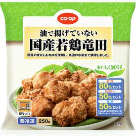 国産の若鶏むね肉(皮なし)を使い、油で揚げずに高温の水蒸気で焼きあげた竜田です。国産にんにく・しょうがの風味をきかせた醤油をベースの味付けに仕上げました。レンジで加熱するだけの簡単調理です。脂質80%カット、カロリー50%カット、塩分50%カットです。