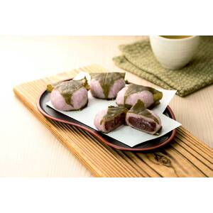 新潟県産もち米、国産小豆を使用。こしあんが入った、小ぶりなひと口サイズの桜餅です。室温で解凍してどうぞ。