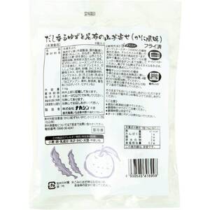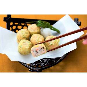 魚肉すり身、れんこん、玉ねぎ、紅ずわいがに等を使用。ふんわりとした魚肉すり身に、ゆず皮と昆布を混ぜ込み、青さ入りの衣をつけた磯辺天です。かつおと昆布のだし感とかにの風味やれんこんの食感が楽しめます。