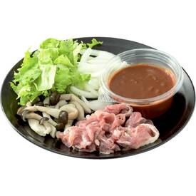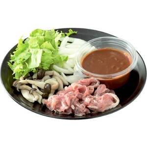 国産豚肉、玉ねぎ、ぶなしめじ、レタス、ソースのセットです。セット内容 肉:国産豚小間肉100g 野菜:60g(玉ねぎ・レタス) ぶなしめじ:40g ソース:140g 調理時間目安約10分 ※ご飯はご用意ください