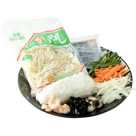 国産もやし、ボイル済みビーフン、中華炒めだれ、玉ねぎ、えび(加熱済み)、人参、ぶなしめじ、きくらげ、にらのセットです。ビーフンは水戻し済みなので、時短になり簡単に調理できます。セット内容 ボイル済みビーフン:200g えび:6尾 野菜:260g(もやし・玉ねぎ・人参・にら) ぶなしめじ:20g きくらげ:15g 中華炒めだれ:2袋 調理時間目安約10分