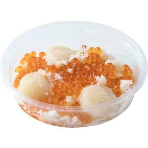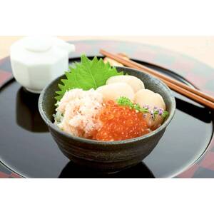 北海道沖で漁獲した海の幸(ほたて貝・オオズワイガニ・鮭の卵)を海鮮丼の具に仕上げました。ほたて貝柱、ボイルオオズワイガニ、いくら醤油漬の3種。