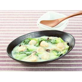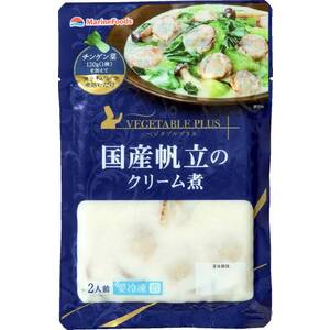 国産帆立・ぶなしめじを使用。解凍後、フライパンでチンゲン菜120g又はお好みの野菜(白菜180g・ほうれん草200g等)と煮込むだけで、簡単にクリーム煮がつくれます。2人前。