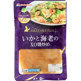 味付いか・えびをXO醤のたれであえました。レタス130g(約1/3個)又はお好みの野菜(アスパラ130g、長ネギ180g)を加えて炒めるだけ。2人前。