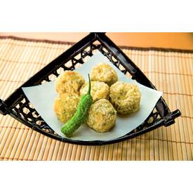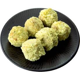 魚肉すり身のふんわりしたベースに、いかと大葉を混ぜ込んだ天ぷらです。カツオとコンブエキスを使っただしの香りと、爽やかな大葉の風味が味わえます。