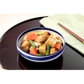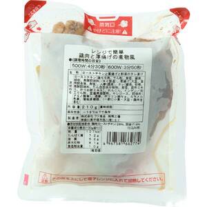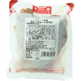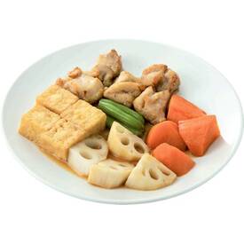 鶏モモ肉使用のローストチキン、厚揚げ、国産人参、れんこん、インゲン入り。かつお節・昆布エキスを使った和風醤油ダレで煮物風に仕上げました。袋のままレンジで加熱してお召しあがりください。