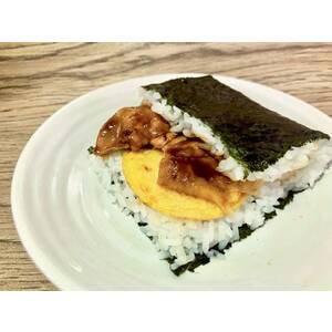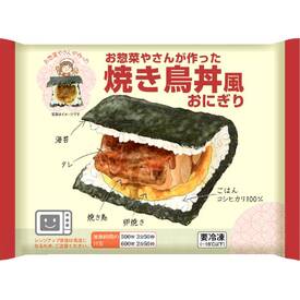 ブラジル産鶏肉を使用。甘辛い醤油たれ味の焼き鳥と、だし卵焼きの入ったおにぎりです。