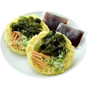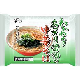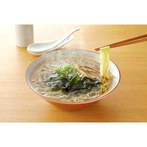 コシのある中華麺に、わかめ、味付けメンマ、ねぎの具と、あっさりとした醤油ベースのスープをセットしました。かんすい使用。
