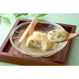 魚肉すり身に、オクラ、玉ねぎ、えび、人参の具が入ったしんじょうです。あんは白だしベースに昆布、魚介のエキスをブレンドし、大根おろしでさっぱりと仕上げました。