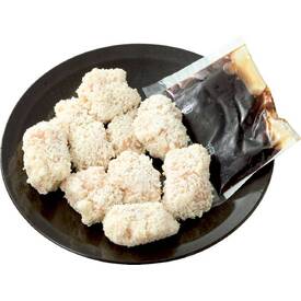 鶏ササミ肉(国産)をひと口大にカットして調味液に漬け込み、乾燥パン粉をまぶしました。ソースは北海道産真昆布使用だしに、たまり醤油と熟成蔵出し黒みりんのコクとキレのあるタレを使用しました。鶏肉のふっくら柔らかい食感に染み込んだ、だしの風味が食欲をそそります。玉ねぎ1/2~1個と卵2個を用意するだけ。