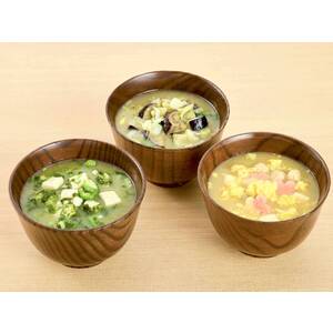 揚げなすとやさい・海苔とおくら各3食、卵と鶏団子2食を詰合せました。米みそと豆みその合わせみそに、かつおと昆布、いわしのだしを加えた具だくさんのみそ汁です。