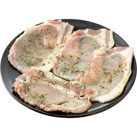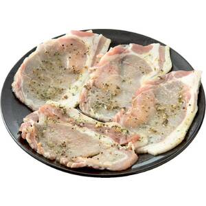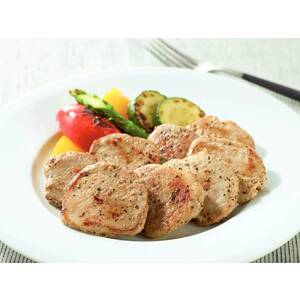 豚ヒレ肉(チリ産)を、ガーリックをきかせたバジルソースで味付けしました。厚さ約10mm。