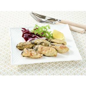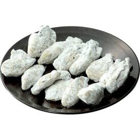 かき(広島県産)に粉付けしました。凍ったままフライパンで焼いてお召しあがりください。蓋をして蒸し焼きにすると、かきがプリッと美味しく仕上がります。薄衣が付いているので、かきフライの下ごしらえとしてもどうぞ。