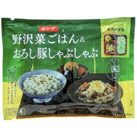香り豊かな野沢菜ごはん、おろし豚しゃぶしゃぶポン酢、4種の煮物(揚げなす、がんも、にんじん、いんげん)をセットしました。切れ目を入れて袋のままレンジ調理できます。トレイサイズ20.0×26.0×3.0cm