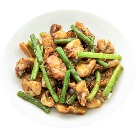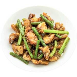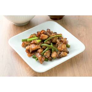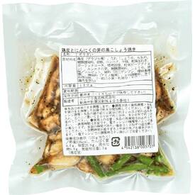 鶏皮(ブラジル産)をボイルしてから焼きあげて余分な脂を落とし、にんにくの芽を加え、黒こしょう・にんにくの風味が香る黒こしょうダレで味付けしました。鶏皮の柔らかい食感とにんにくの芽のシャキッとした食感が楽しめます。