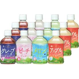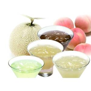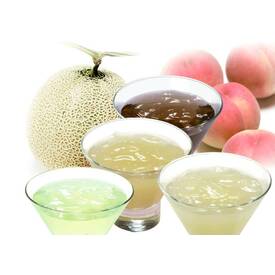 振って崩して飲むゼリー飲料のアソートです。山梨県産もも使用のピーチジュレ、北海道産メロン使用のメロンジュレ、青森県産りんご使用のアップルジュレ、長野県産ぶどう使用のグレープジュレを詰合せました。果汁各1%。