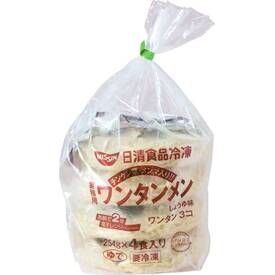 肉入りワンタン3個、チンゲン菜、味付メンマの具入り。ゆであげを急速冷凍したコシとツルミのある中細めんに、チキンとポークをベースにした、コクのあるあっさりしょうゆ味のスープをあわせました。かんすい使用。