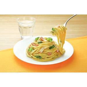 めんにデュラム小麦のセモリナを使用。ほうれん草、ブロッコリー、たまねぎ、ベーコンの具入り。国産柚子果汁と果皮ペーストを使用し、かつおと昆布の旨みを加えた、醤油ベースの和風パスタです。爽やかな柚子の香りが楽しめます。