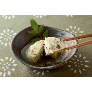 魚肉すり身に、3種類のきのこ(まいたけ、きくらげ、しいたけ)、枝豆、玉ねぎ、人参、ごぼうが入った、しっとりやわらかいしんじょうです。ほんのり生姜が香る和風あんをあわせました。