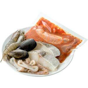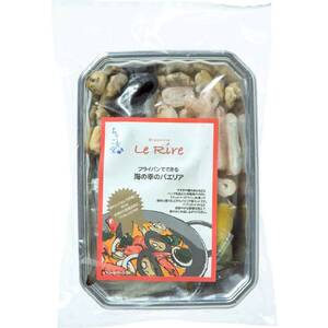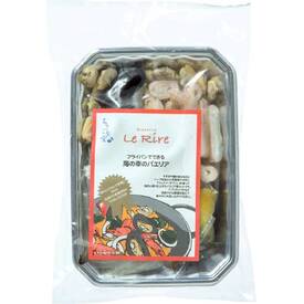 まついか(アメリカ産)、海老(エクアドル産)、ムール貝(チリ産)、あさりの4種の魚介と、パエリア調味液35g×2、すずきのあら等にハーブを加えた洋風魚のだし「フュメ・ド・ポワソン」30g×2をセットしました。1袋4人前。ご飯(4人前:800g)があれば、フライパンで手軽に調理できます。解凍後、調理してお召しあがりください。