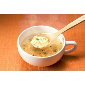 • 国産鶏卵を使用。チキンエキスとブイヨンの旨みをベースに、かに風かまぼこ、わかめ、ねぎを入れた、ふんわりとたまごが広がるスープです。