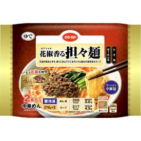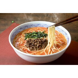 • ひき肉、ほうれん草等の具入り。具材とスープに3種類のごま(焙煎皮付き金ごま・皮むき練りごま・焙煎皮付き練りごま)を使用し、コクと旨みを出した濃厚なスープに仕上げました。花椒の香りと辛さをきかせた担々麺です。かんすい使用。