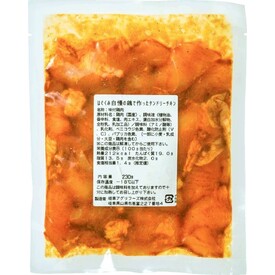 • はぐくみ自慢の若鶏ムネ肉・モモ肉を、ニンニクと生姜をきかせたしょうゆ味のタレに漬け込みました。辛くない、お子さまにも食べやすい味付けです。