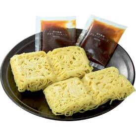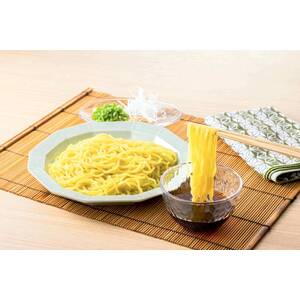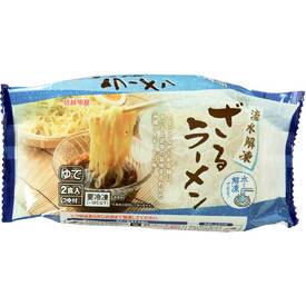 流水で解凍できるざるラーメンです。のどごしなめらかな麺に、かつおと昆布の旨みがきいた和風つゆをあわせました。かんすい使用。