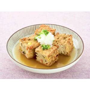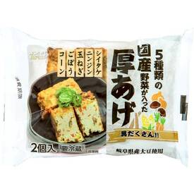 岐阜県産大豆「フクユタカ」100%、にがりを使用。5種類の国産野菜(たまねぎ・にんじん・とうもろこし・しいたけ・ごぼう)が入った、野菜の食感が楽しめる具だくさんの厚あげです。