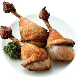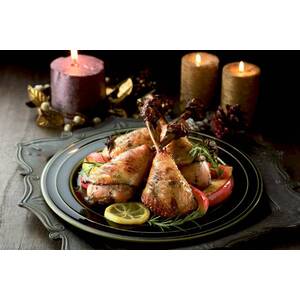 九州産みつせ鶏骨付きモモ肉ドラム部位を使用したローストチキンです。モモ肉の力強い旨みを生かして、塩とガーリックをしっかりきかせた味付けに仕上げました。