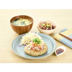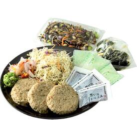 ハンバーグ、キャベツミックス(キャベツ・レッドキャベツ・人参千切り)、大根おろし、味付ぽん酢、レッドオニオン、小ねぎ、赤ピーマン、黄ピーマン、ひじきとお豆の和風サラダ、味噌汁用具材(わかめ・玉ねぎ・油揚げ・だし)のセットです。セット内容 ハンバーグ:2個 野菜:120g(キャベツ・レッドオニオン・人参・レッドキャベツ・小ねぎ・赤ピーマン・黄ピーマン) 大根おろし:2袋 味付ぽん酢:2袋 ひじきとお豆の和風サラダ:120g 味噌汁用具材:70g(わかめ・玉ねぎ・油揚げ・だし) 調理時間目安約10分 ※味噌はご用意ください