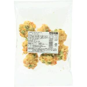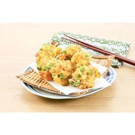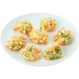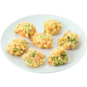 コーン、枝豆に、ダイスカットした人参、玉ねぎをバランスよく混ぜ込み、食べやすいサイズにまとめて天ぷら粉で揚げました。ホクホクした食感と野菜の甘みが楽しめます。