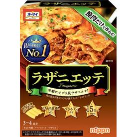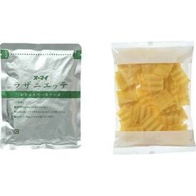 デュラム小麦のセモリナを使った小さくて食べやすいラザニエと、ベースソースにコク深くクリーミーなトマトソースをセットしました。挽肉をご用意ください。挽肉とラザニエ、ベースソースをフライパンで炒め、トースターで焼きあげるだけで簡単にボロネーゼソースのラザニエが楽しめます。調理時間約15分。3~4皿分。