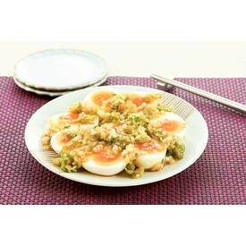 ゆで卵、玉ねぎ和え、つゆをセットしました。セット内容 ゆで卵:4個 玉ねぎ和え:82g つゆ:1袋 調理時間目安約5分 ※ごま油はご用意ください